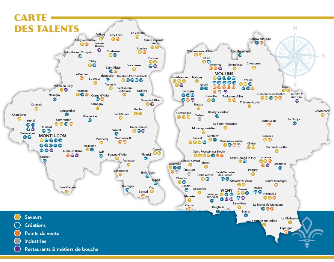 Qu’ils soient producteurs, artisans, points de vente, industriels, restaurateurs ou un autre métiers de bouche, tous les talents dans ce guide font la fierté bourbonnaise.